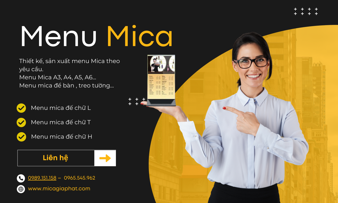 Trong ngành dịch vụ và kinh doanh, menu mica đang trở thành lựa chọn hàng đầu cho nhà hàng, quán cà phê, khách sạn và nhiều mô hình kinh doanh khác. Với tính thẩm mỹ cao, độ bền vượt trội và khả năng tùy chỉnh linh hoạt, menu mica không chỉ giúp trưng bày thông tin chuyên nghiệp mà còn nâng cao hình ảnh thương hiệu trong mắt khách hàng.